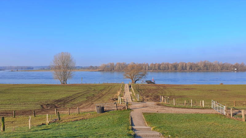 Anschließend durchquert man Götterswickerhamm und fährt wenig später wieder auf der Deichkrone entlang, bis zu der Stelle, an der die Alliierten 1945 den Rhein überquerten und wo heute ein Gedenkkreuz steht.
